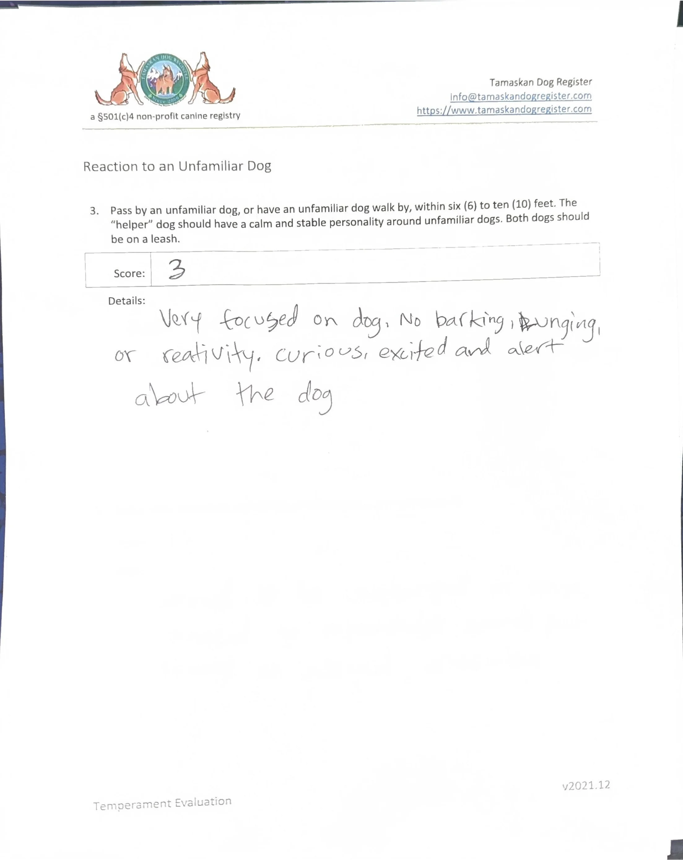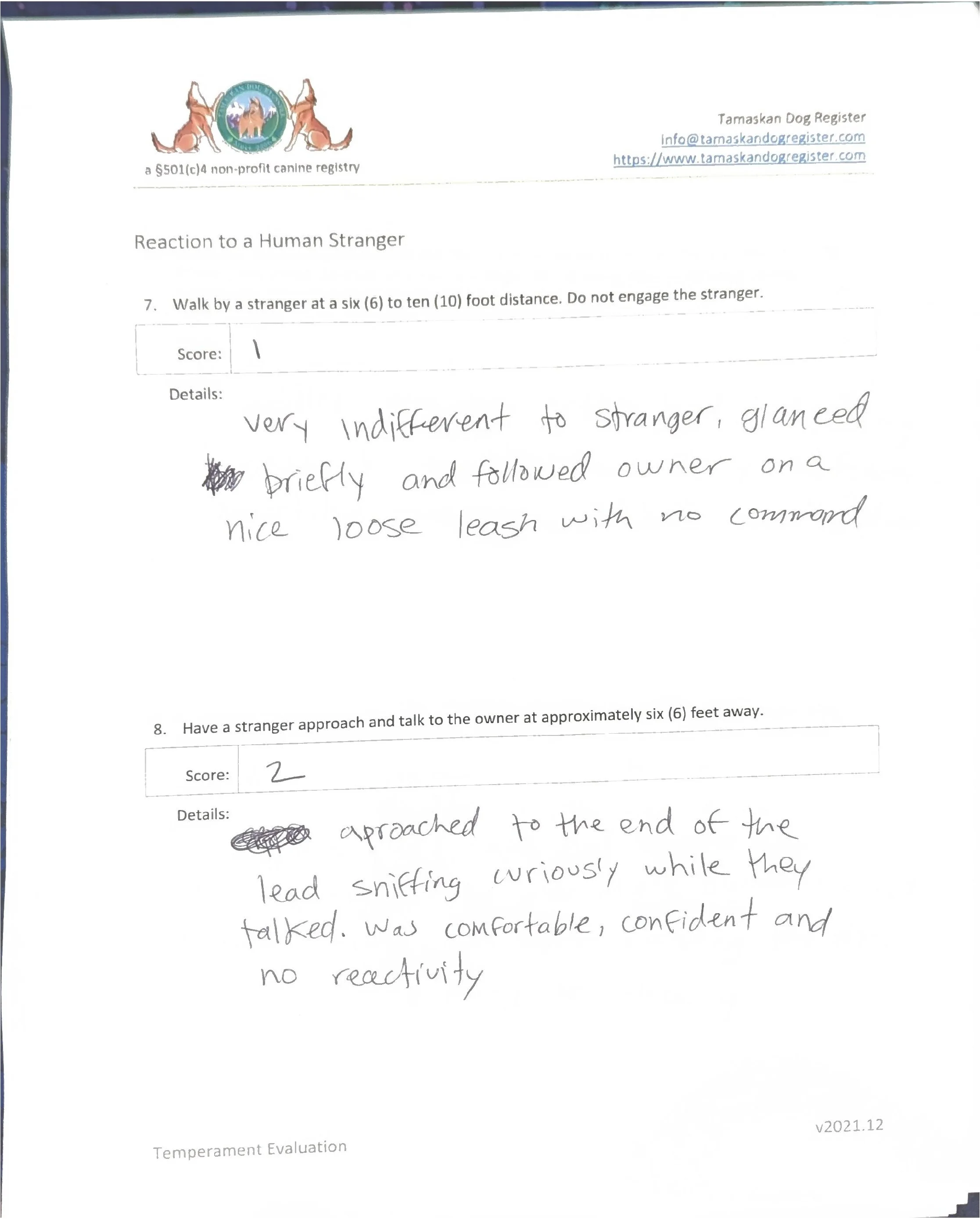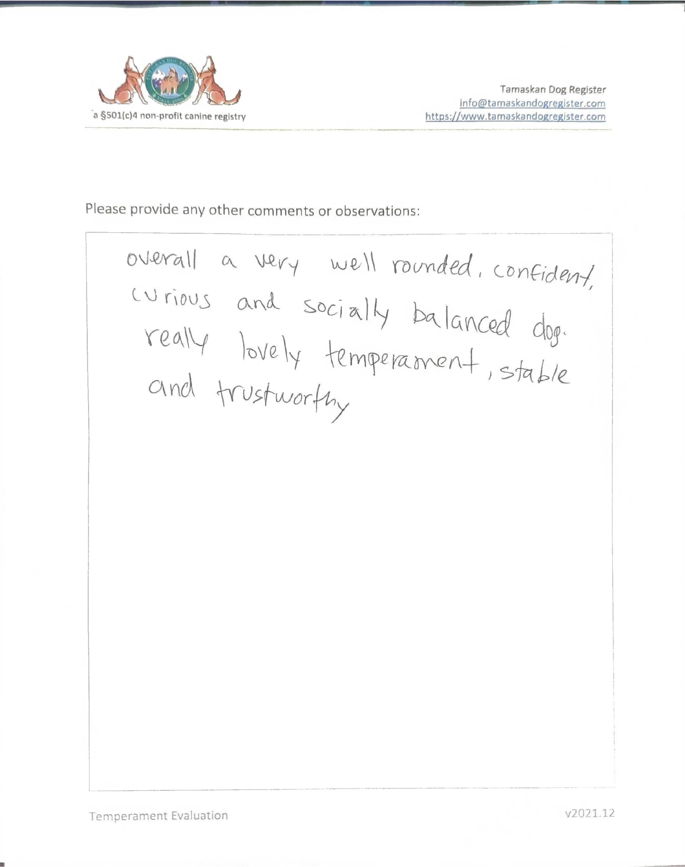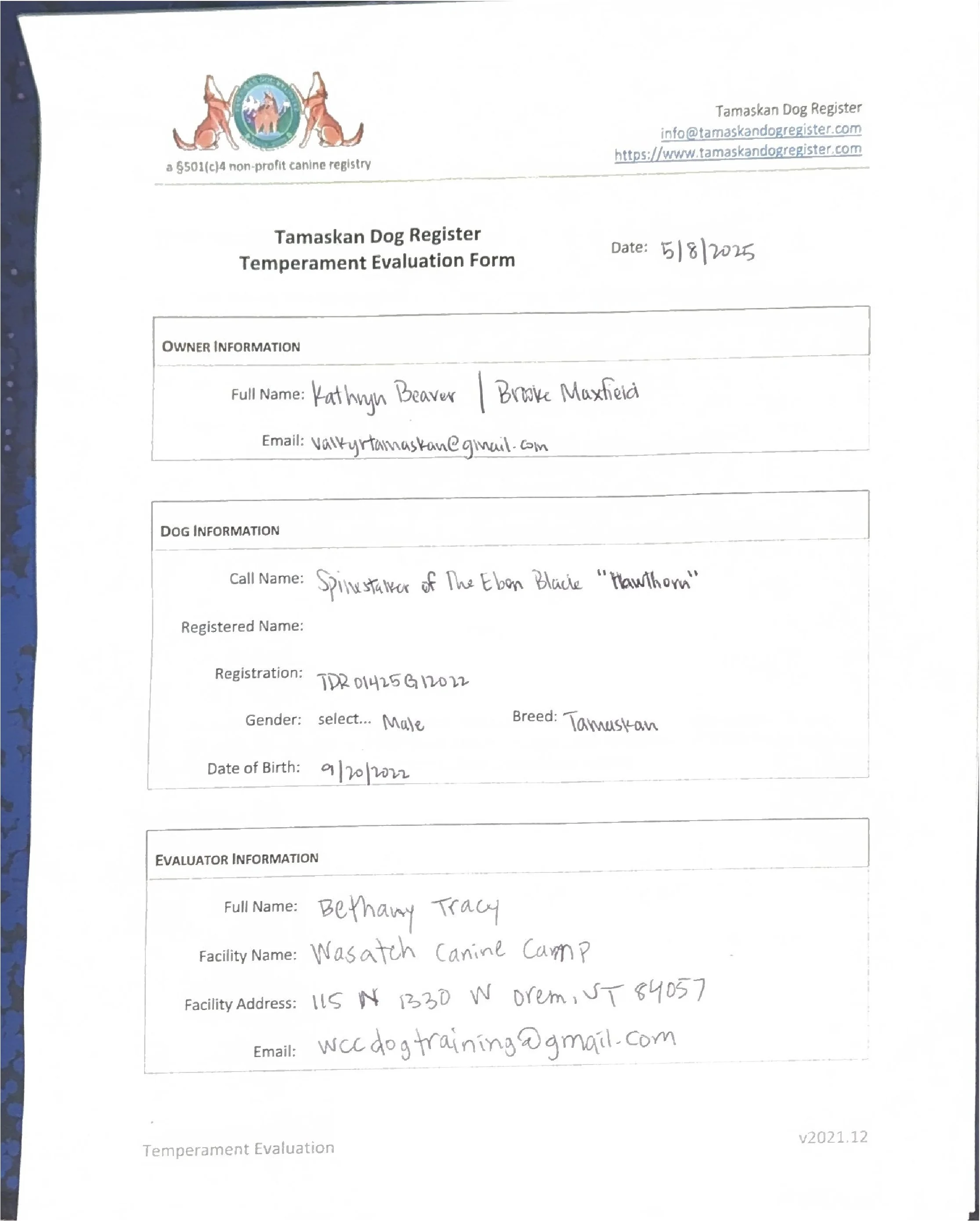 Hawthorn’s temperament was professionally evaluated by Wasatch Canine Camp in Orem, UT on May 8, 2025. The evaluation was conducted according to the format required by the Tamaskan Dog Register.