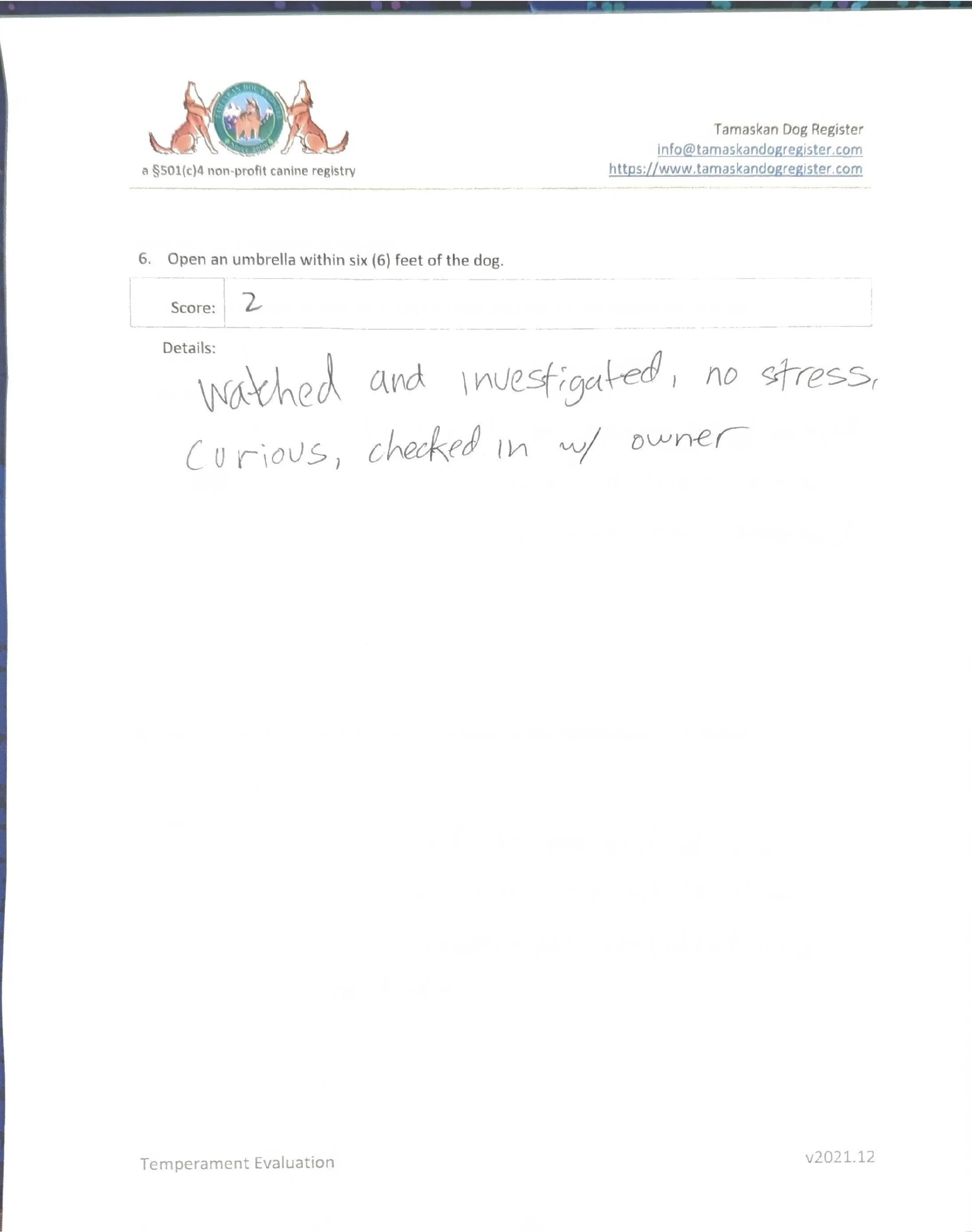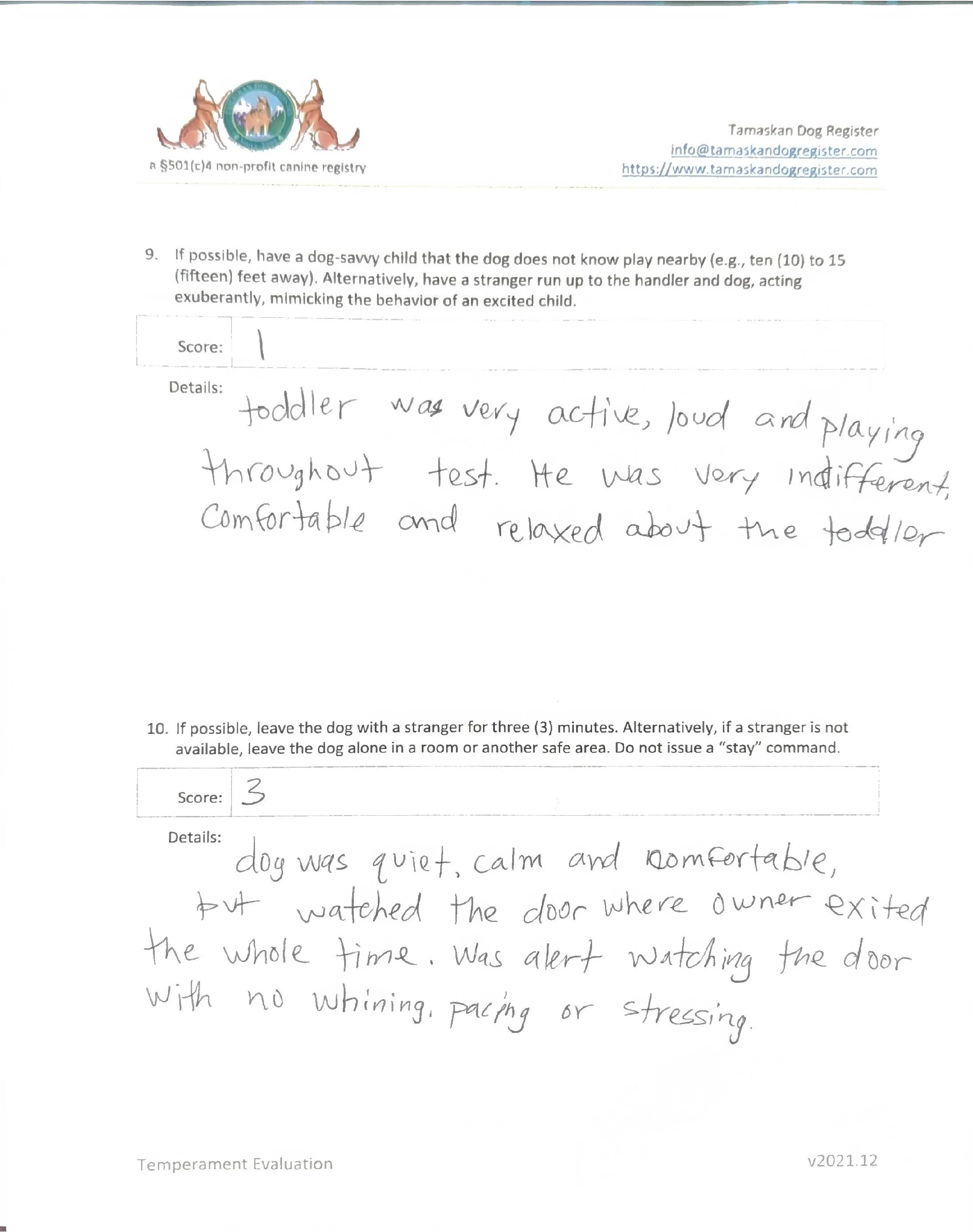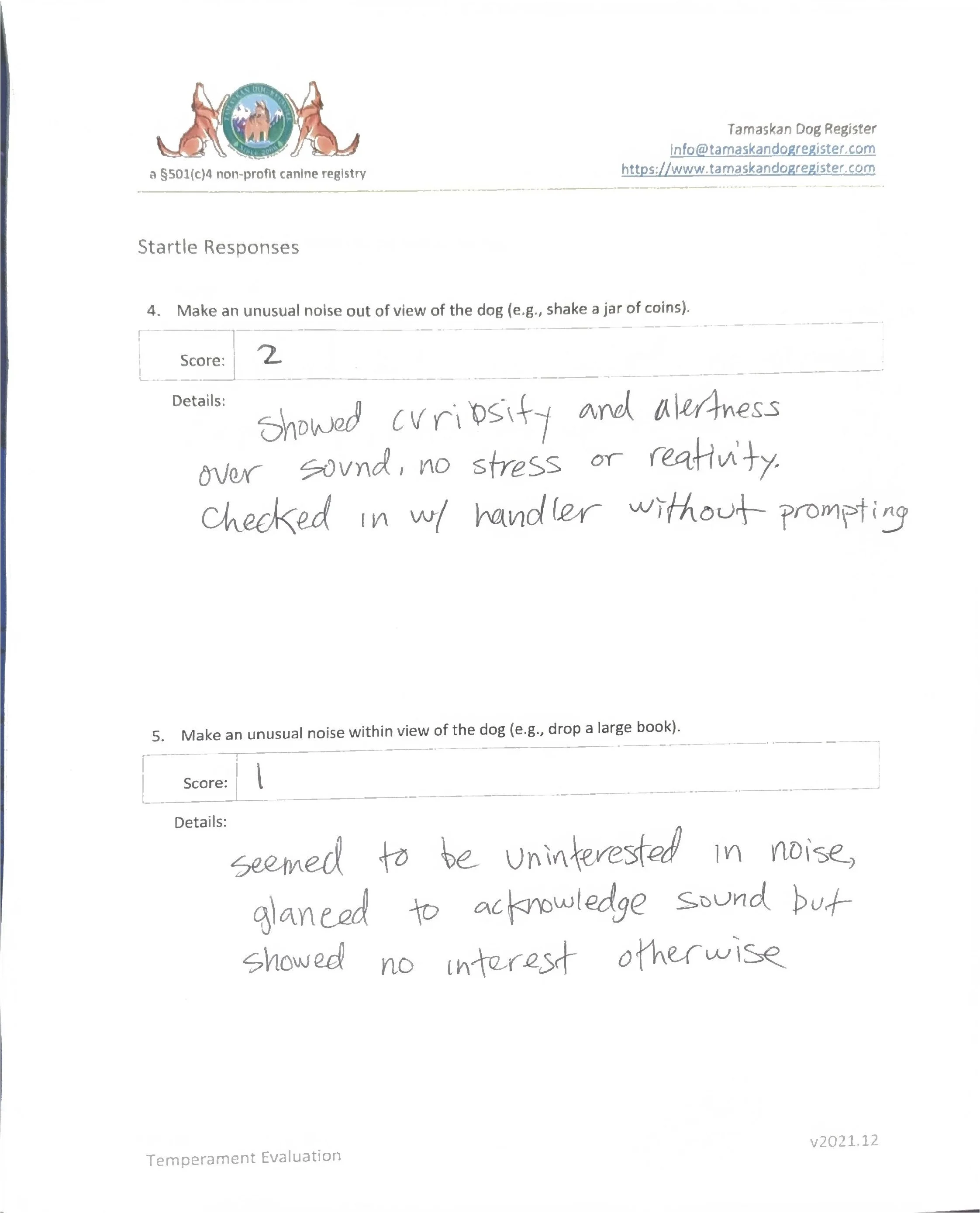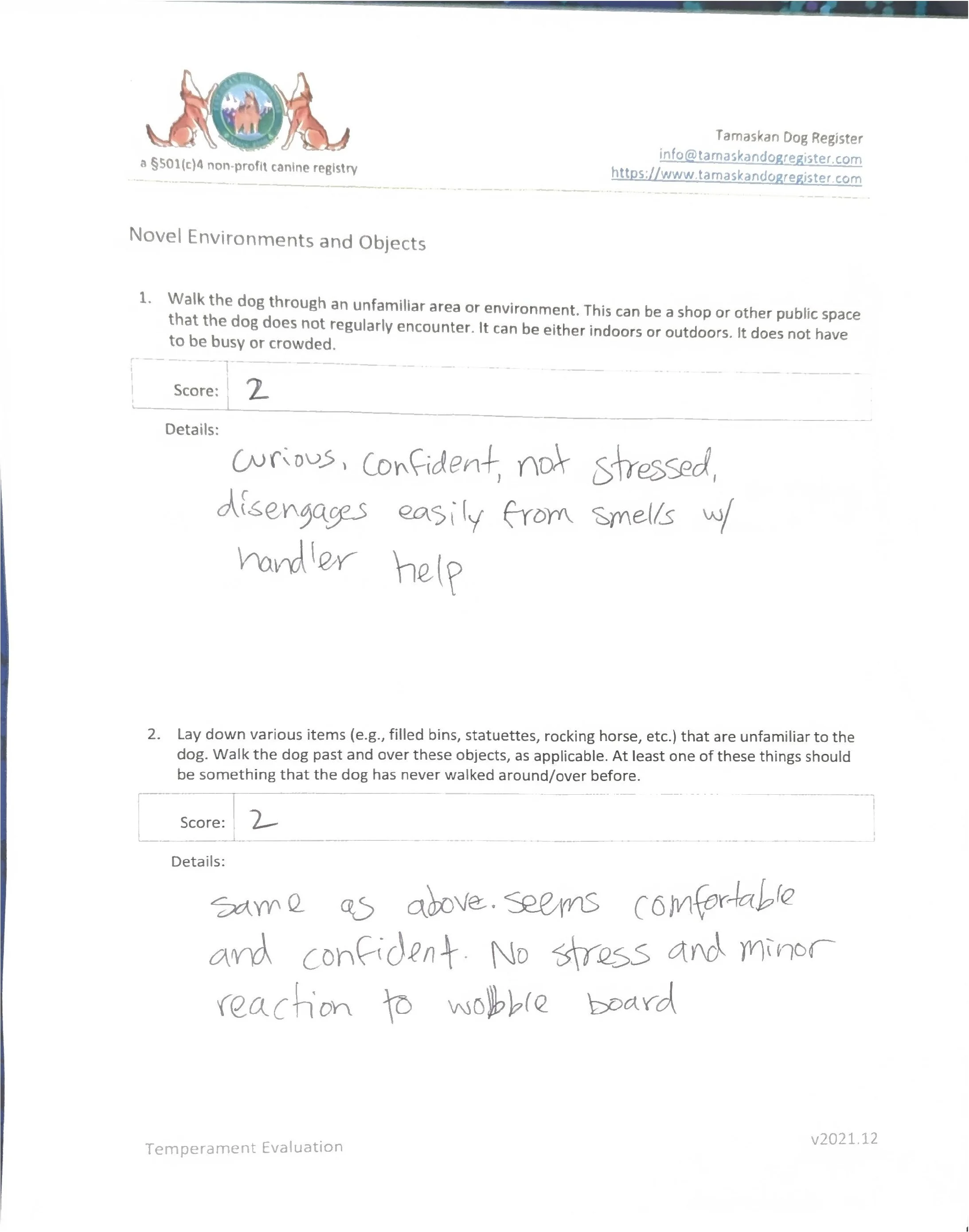 Hawthorn’s temperament was professionally evaluated by Wasatch Canine Camp in Orem, UT on May 8, 2025. The evaluation was conducted according to the format required by the Tamaskan Dog Register.