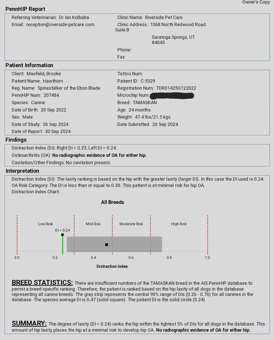 PennHip: Right DI = 0.23, Left DI = 0.24. No radiographic evidence of Osteoarthritis for either hip. No cavitation present. Hawthorn’s hips rank within the tightest 5% of all dogs (all breeds) in PennHip’s database.