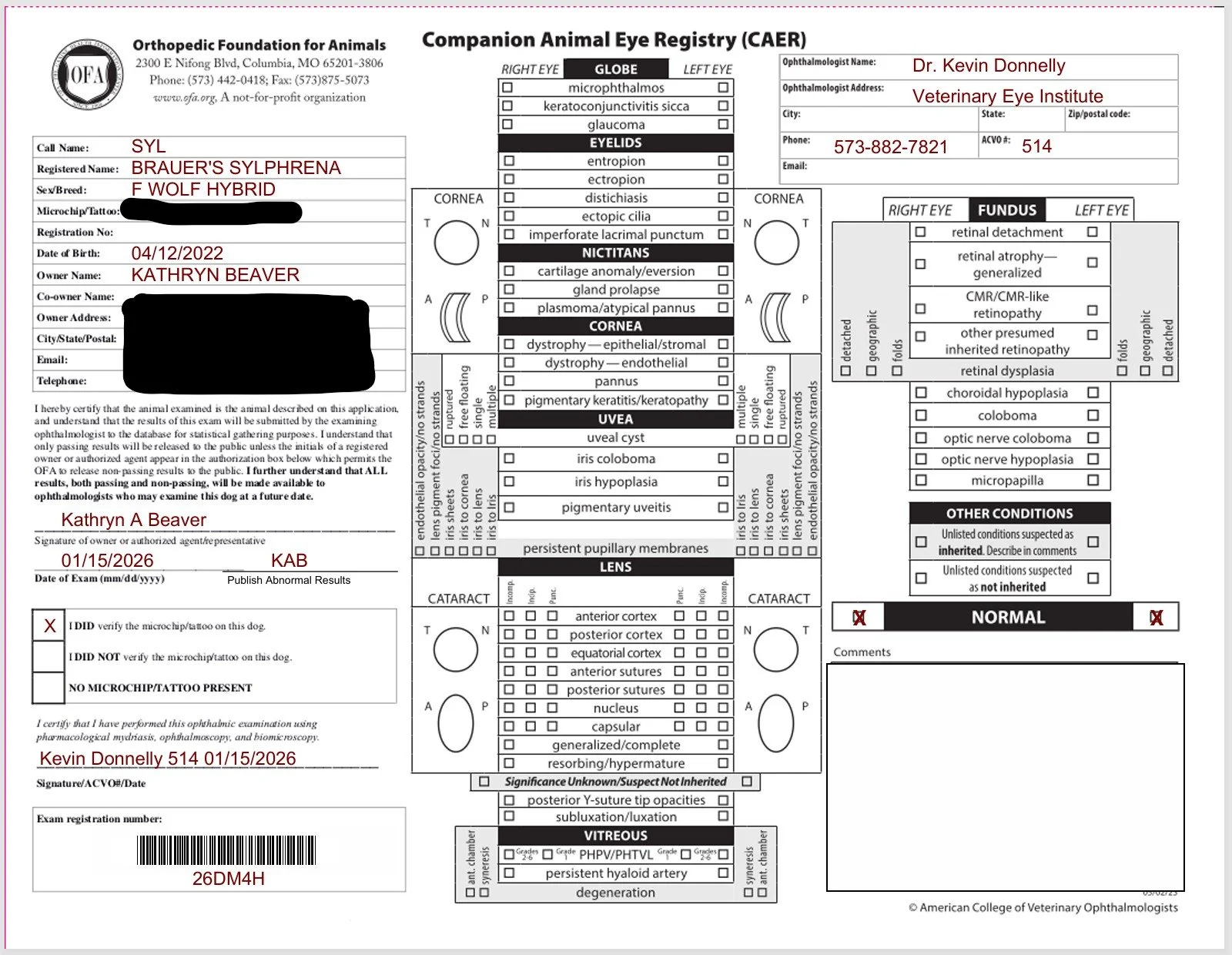 Syls’ OFA CAER eye exam form: Normal (January 2026)