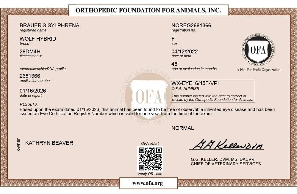 Syl was born on April 12, 2022, and was bred by Don Brauer in Phoenix, AZ. Her parents are The Wolf Crossing’s Rogue (at Brauer) and Soto’s Rayne (at Brauer). Syl was born to a litter of five puppies (2 females, 3 males), and was the only Arctic Type puppy in her litter. She came home with us at 5.5 weeks of age, so that we could begin bonding with her and continue the socialization that her breeder had already started with her as a baby. This socialization window lasts between 4-8 weeks of age for high content wolfdogs, which is why it’s so important that they go home at an early age. Syl is a 95%+ high content wolfdog, like her parents.