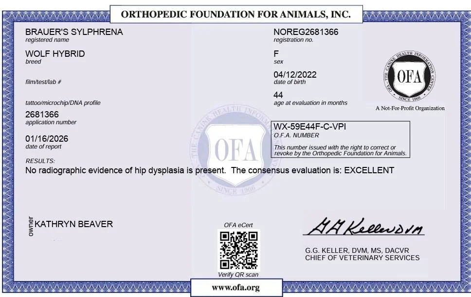 Syl’s OFA Certificate: Hips Excellent